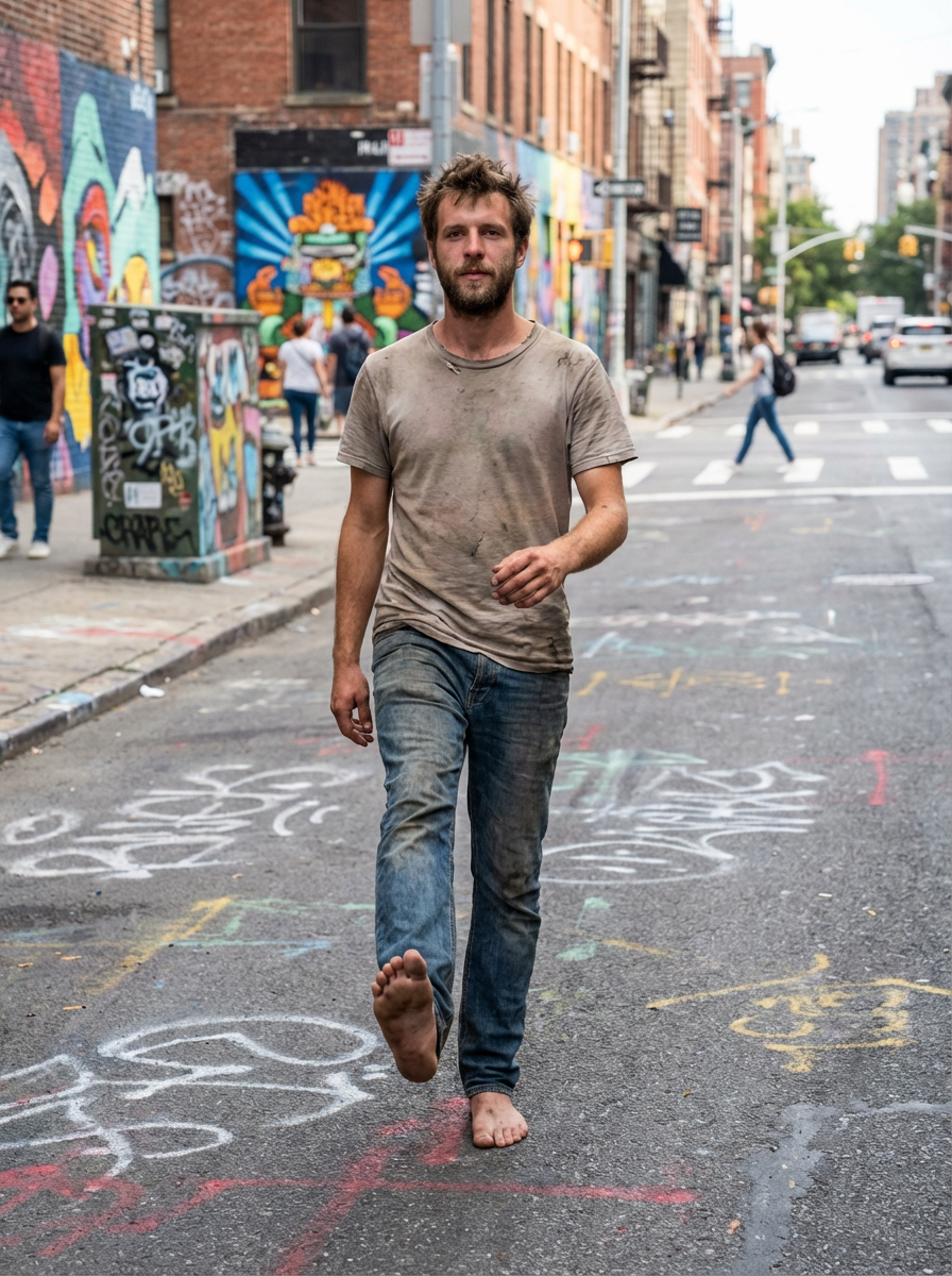 Model's bare feet, walking on a graffiti-covered urban street, capturing the essence of city life, also showing the bottom of feet.