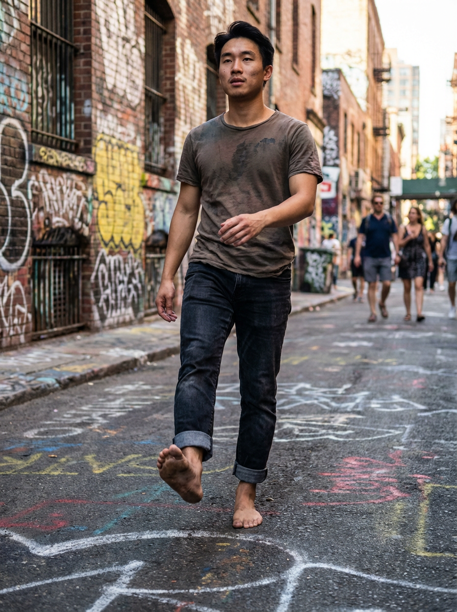 Model's bare feet, walking on a graffiti-covered urban street, capturing the essence of city life, also showing the bottom of feet.