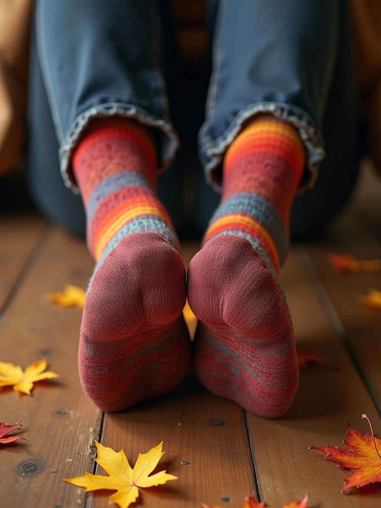 Model's feet in colorful socks, playfully posed on a wooden floor with scattered autumn leaves, evoking a cozy and whimsical vibe, also showing the bottom of feet.