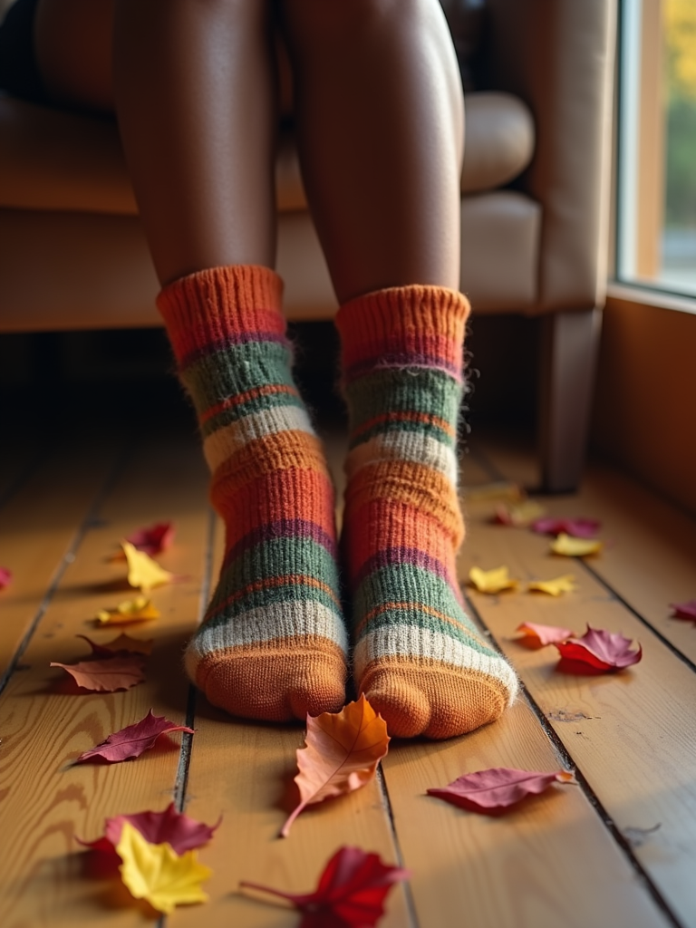 Model's feet in colorful socks, playfully posed on a wooden floor with scattered autumn leaves, evoking a cozy and whimsical vibe, also showing the bottom of feet.