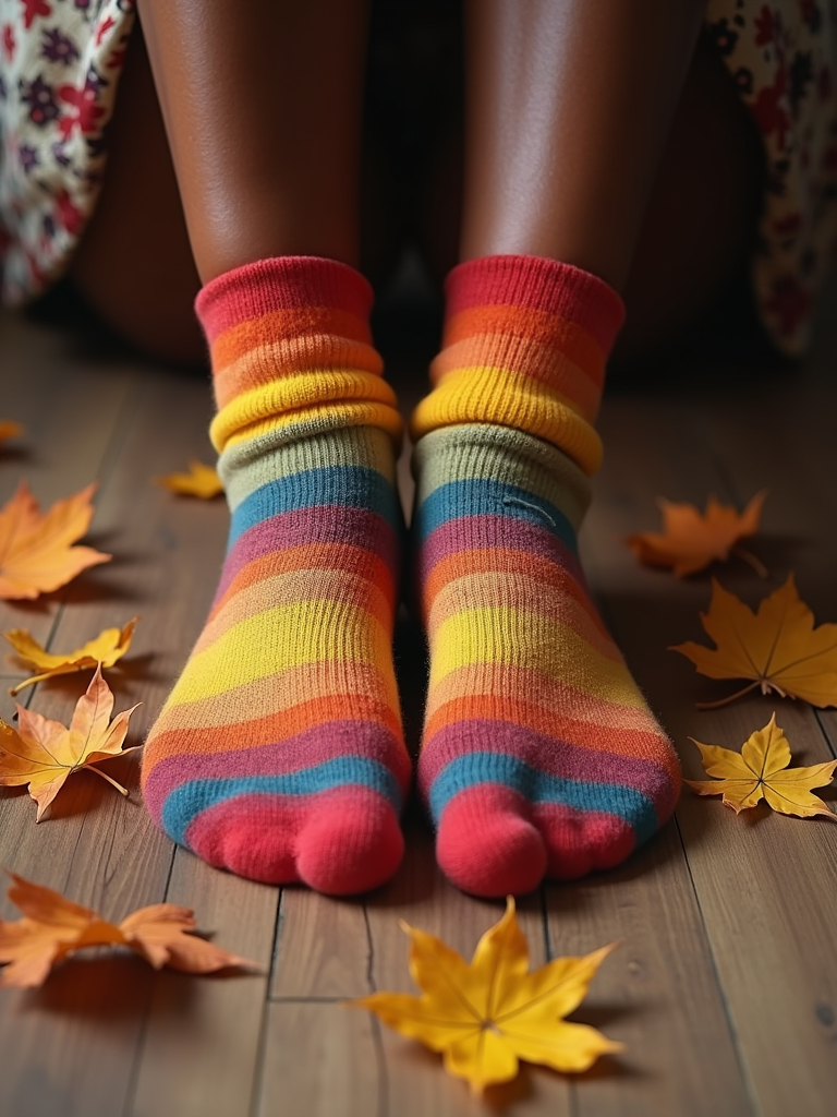 Model's feet in colorful socks, playfully posed on a wooden floor with scattered autumn leaves, evoking a cozy and whimsical vibe, also showing the bottom of feet.