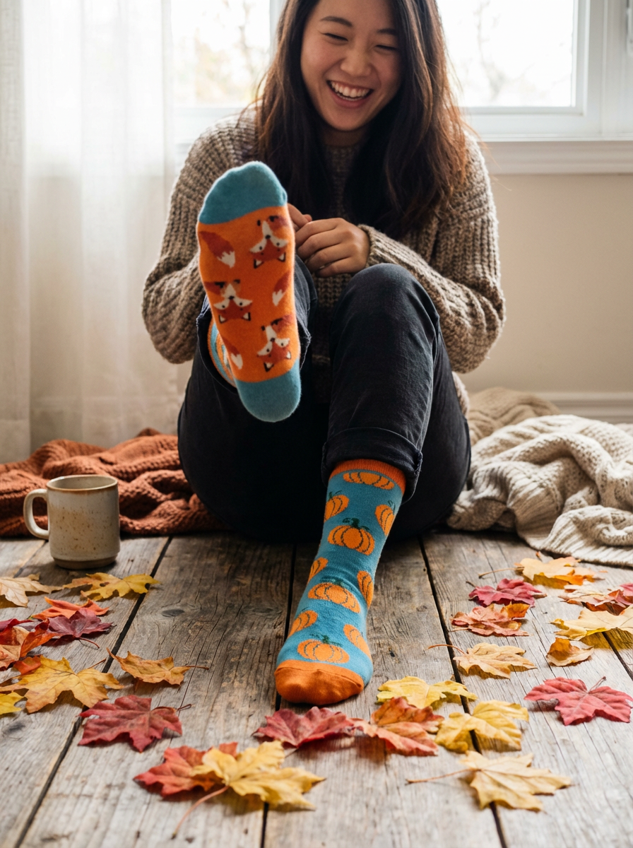 Model's feet in colorful socks, playfully posed on a wooden floor with scattered autumn leaves, evoking a cozy and whimsical vibe, also showing the bottom of feet.