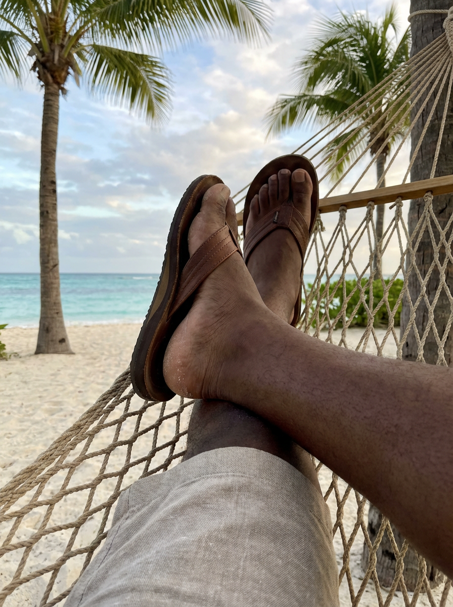 Model's feet in flip-flops, casually resting on a hammock, with a tropical beach and palm trees in the background, also showing the bottom of feet.