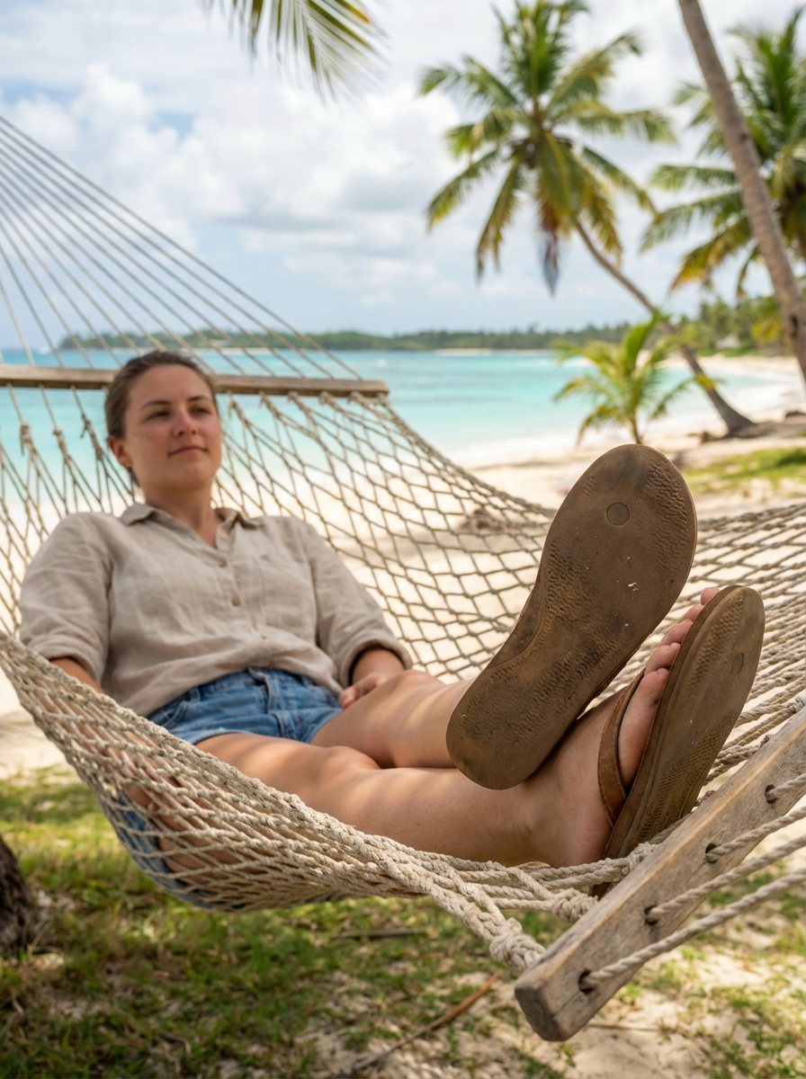 Model's feet in flip-flops, casually resting on a hammock, with a tropical beach and palm trees in the background, also showing the bottom of feet.