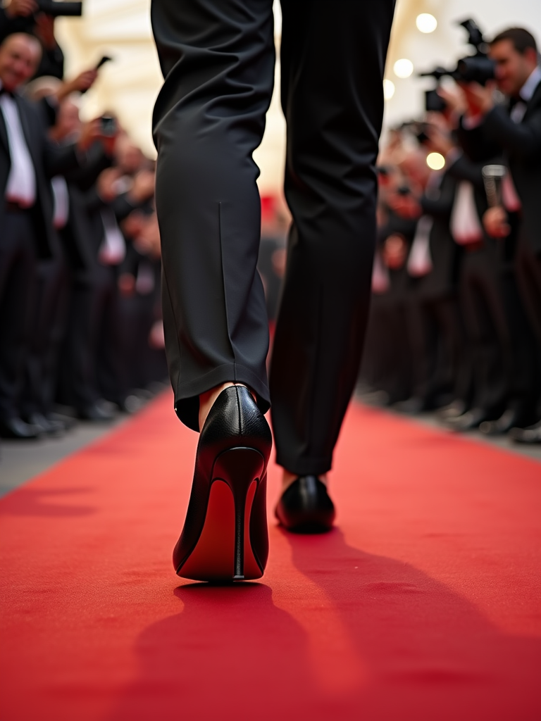 Model's feet in minimalist high heels, stepping confidently on a red carpet, with paparazzi flashes capturing the moment, also showing the bottom of feet.
