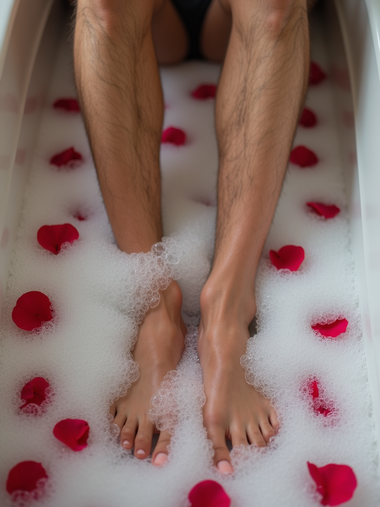Model's feet submerged in a bubble bath, with rose petals floating on the water surface, creating a luxurious and relaxing scene, also showing the bottom of feet.