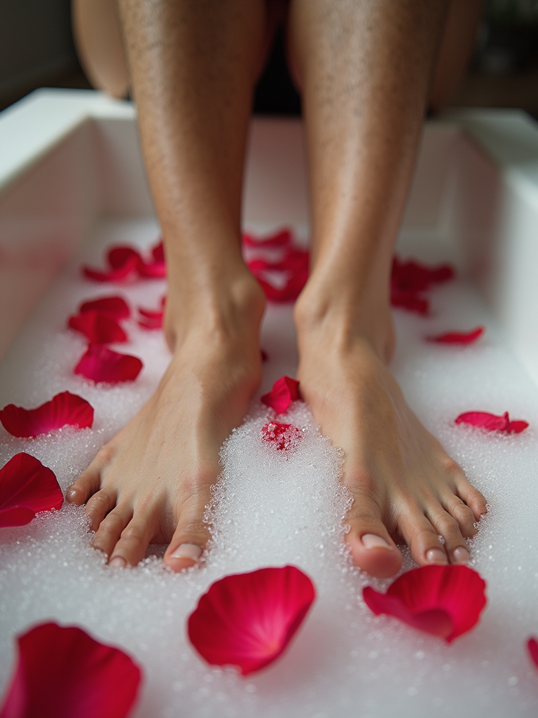 Model's feet submerged in a bubble bath, with rose petals floating on the water surface, creating a luxurious and relaxing scene, also showing the bottom of feet.