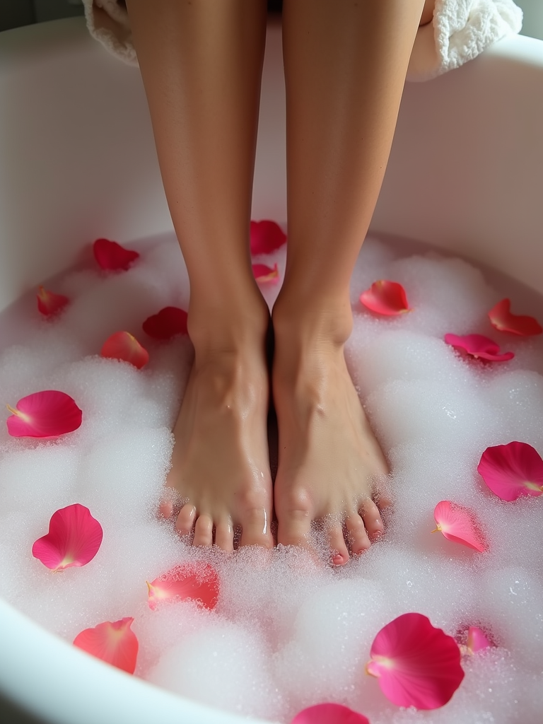 Model's feet submerged in a bubble bath, with rose petals floating on the water surface, creating a luxurious and relaxing scene, also showing the bottom of feet.