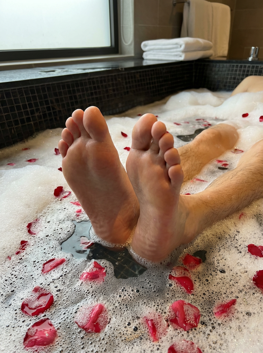 Model's feet submerged in a bubble bath, with rose petals floating on the water surface, creating a luxurious and relaxing scene, also showing the bottom of feet.