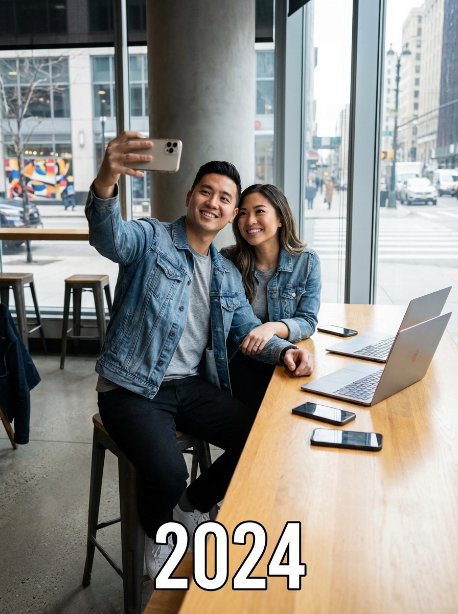 Modern day couple taking a selfie together in contemporary casual clothing, sitting in a trendy coffee shop with laptops and smartphones on the table, natural lighting through large windows, urban lifestyle photography, text overlay in bottom corner reading "{currentYear}" in white sans serif font with black outline