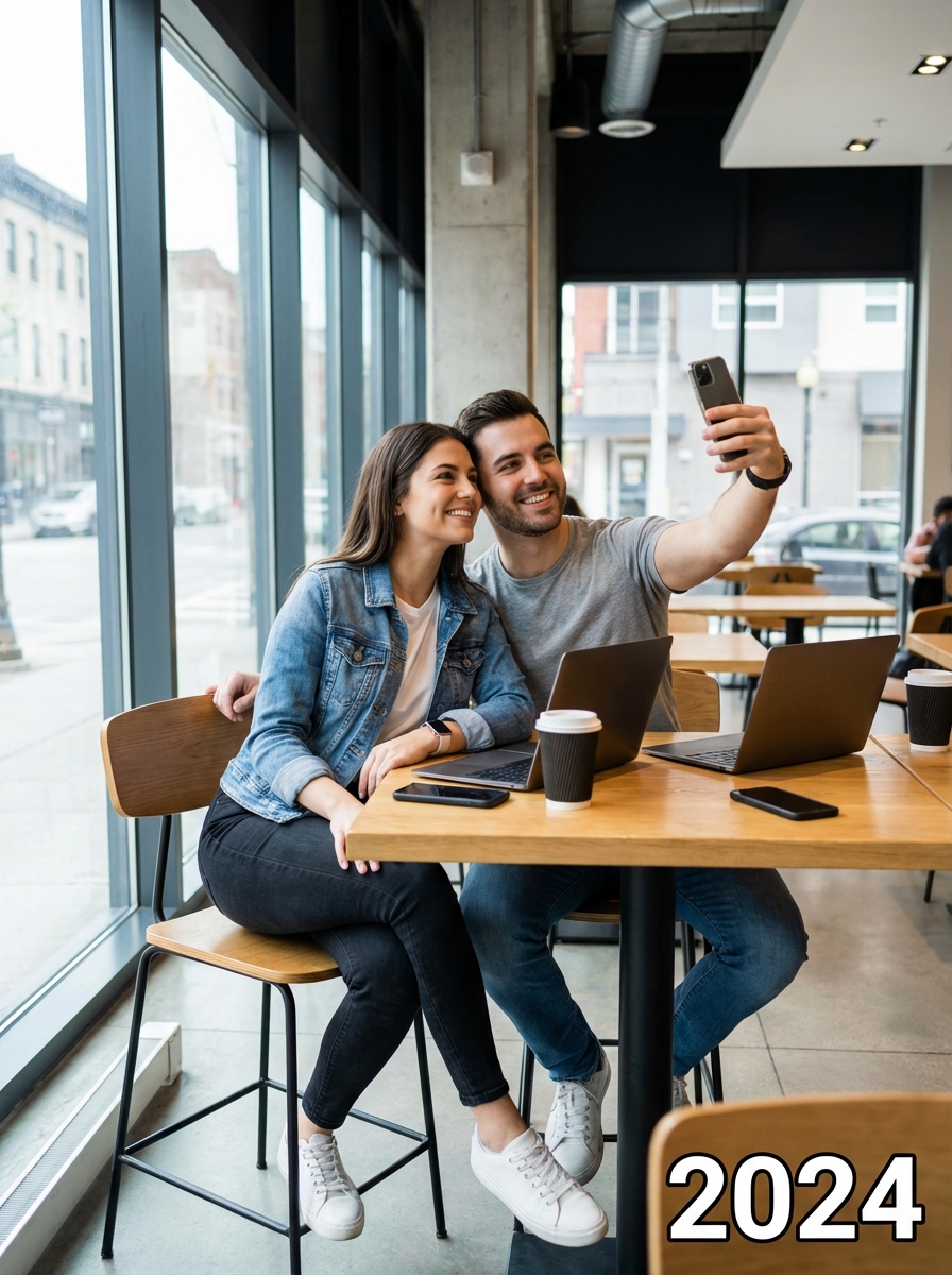 Modern day couple taking a selfie together in contemporary casual clothing, sitting in a trendy coffee shop with laptops and smartphones on the table, natural lighting through large windows, urban lifestyle photography, text overlay in bottom corner reading "{currentYear}" in white sans serif font with black outline