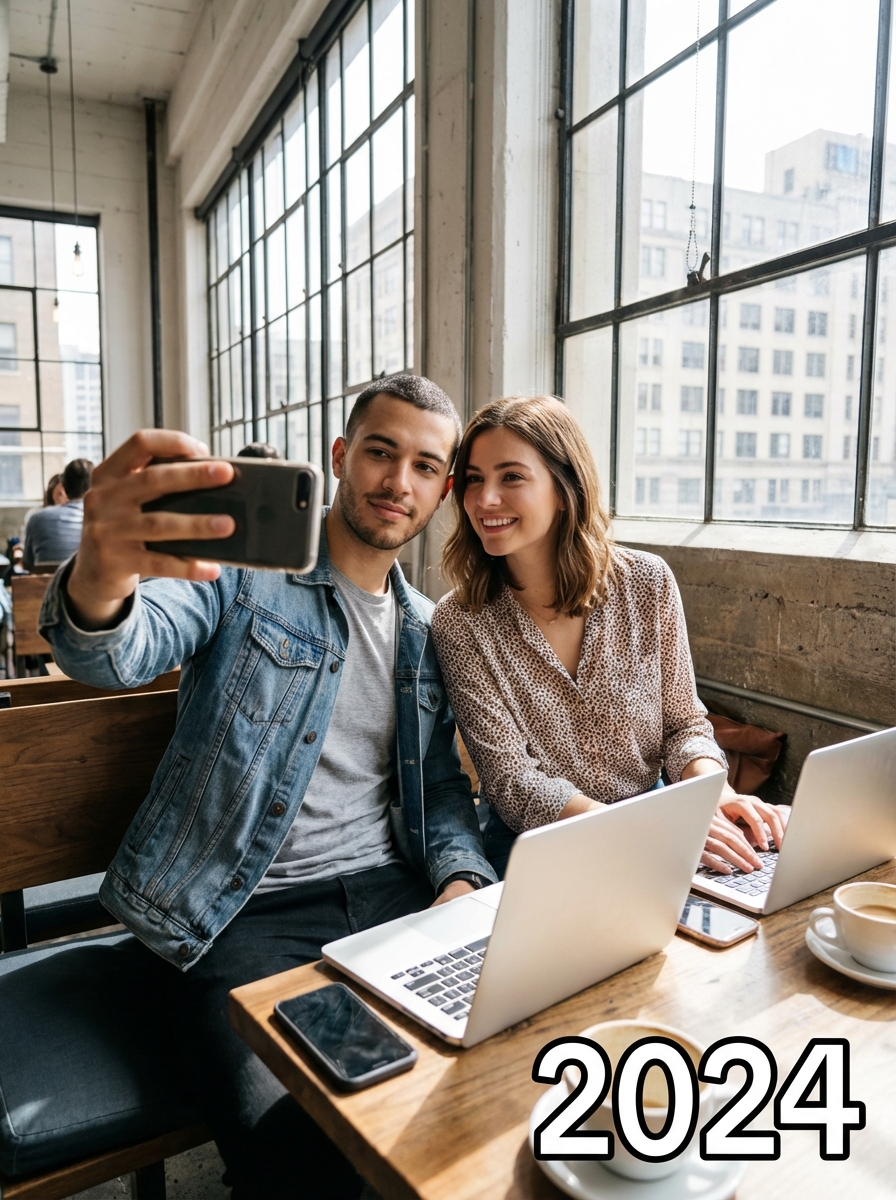 Modern day couple taking a selfie together in contemporary casual clothing, sitting in a trendy coffee shop with laptops and smartphones on the table, natural lighting through large windows, urban lifestyle photography, text overlay in bottom corner reading "{currentYear}" in white sans serif font with black outline