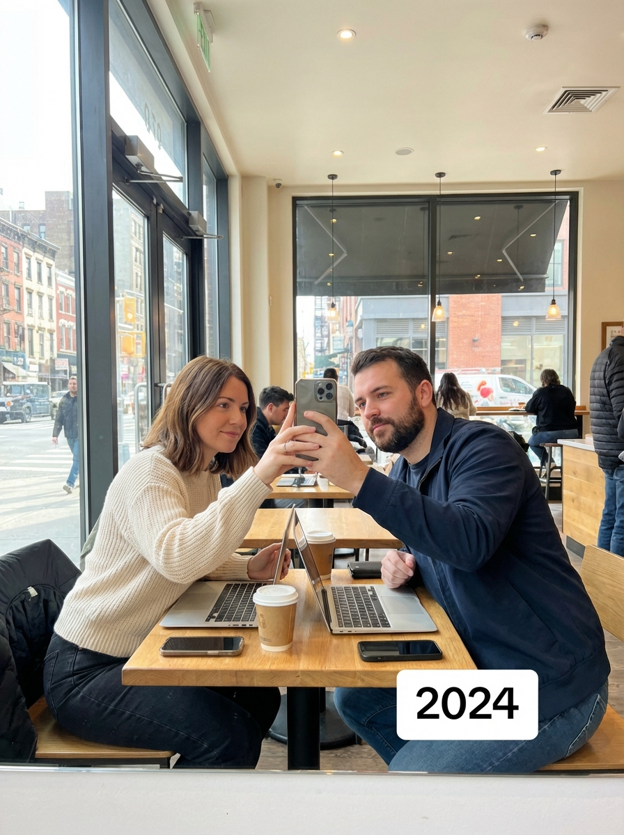 Modern day couple taking a selfie together in contemporary casual clothing, sitting in a trendy coffee shop with laptops and smartphones on the table, natural lighting through large windows, urban lifestyle photography, text overlay in bottom corner reading "{currentYear}" in white sans serif font with black outline