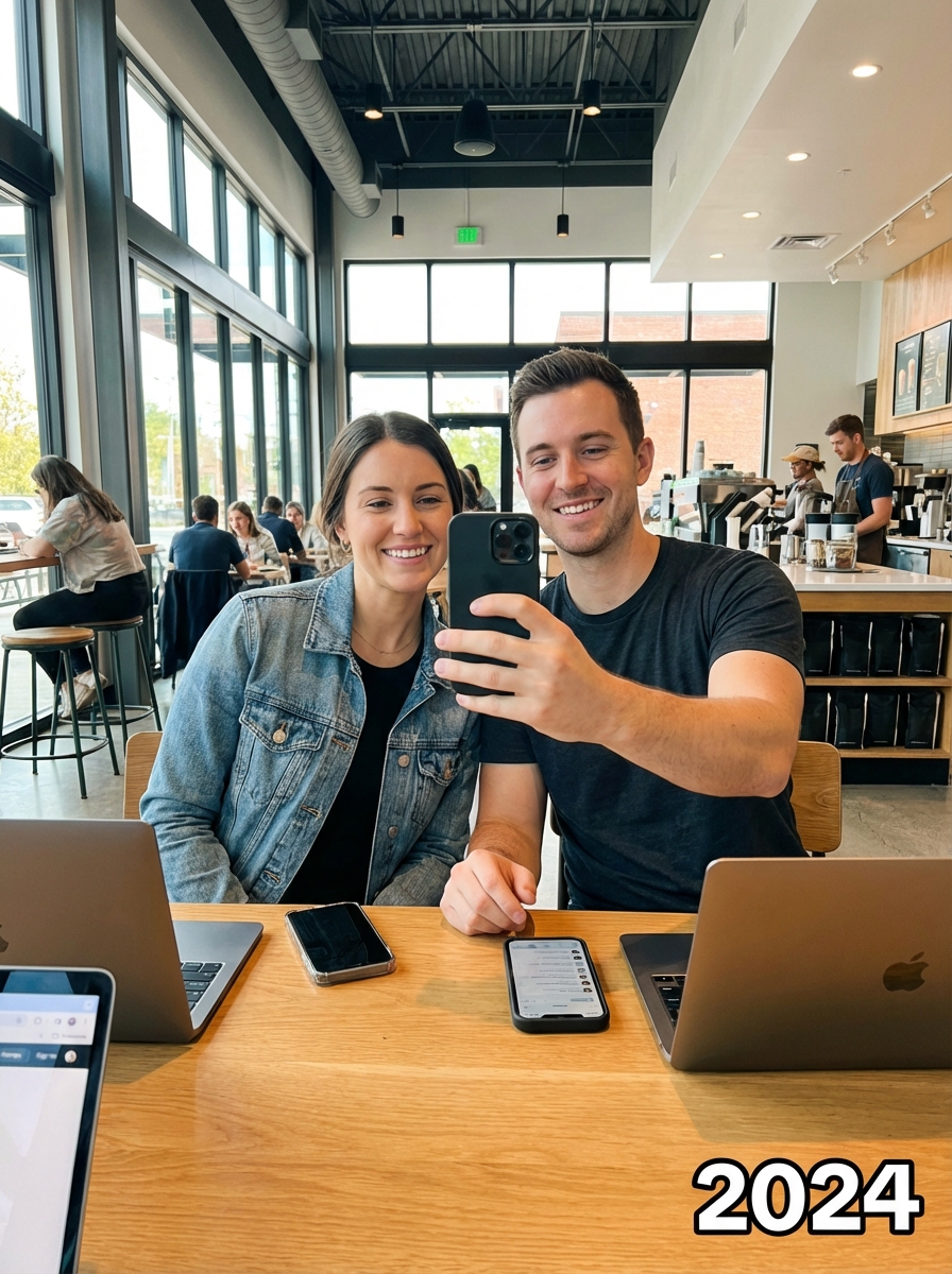 Modern day couple taking a selfie together in contemporary casual clothing, sitting in a trendy coffee shop with laptops and smartphones on the table, natural lighting through large windows, urban lifestyle photography, text overlay in bottom corner reading "{currentYear}" in white sans serif font with black outline