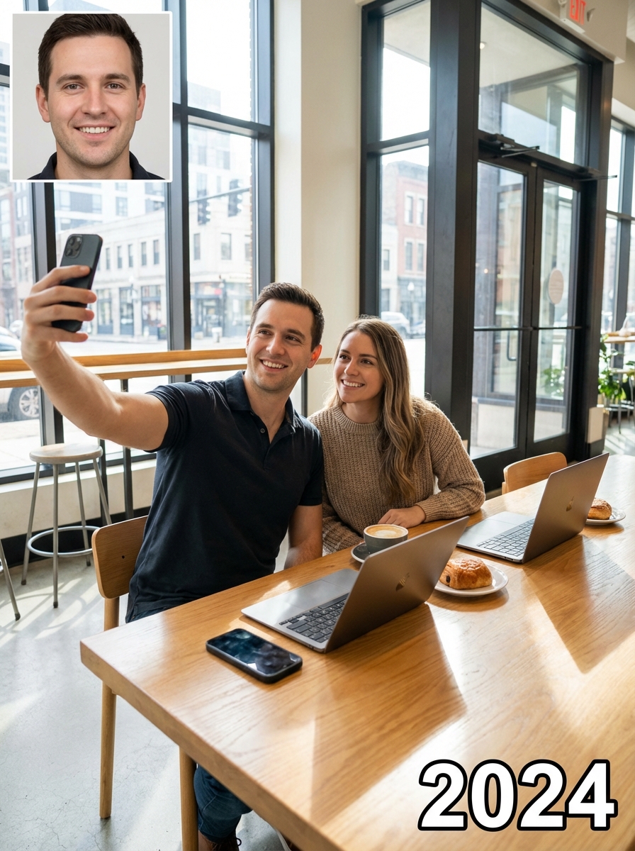 Modern day couple taking a selfie together in contemporary casual clothing, sitting in a trendy coffee shop with laptops and smartphones on the table, natural lighting through large windows, urban lifestyle photography, text overlay in bottom corner reading "{currentYear}" in white sans serif font with black outline