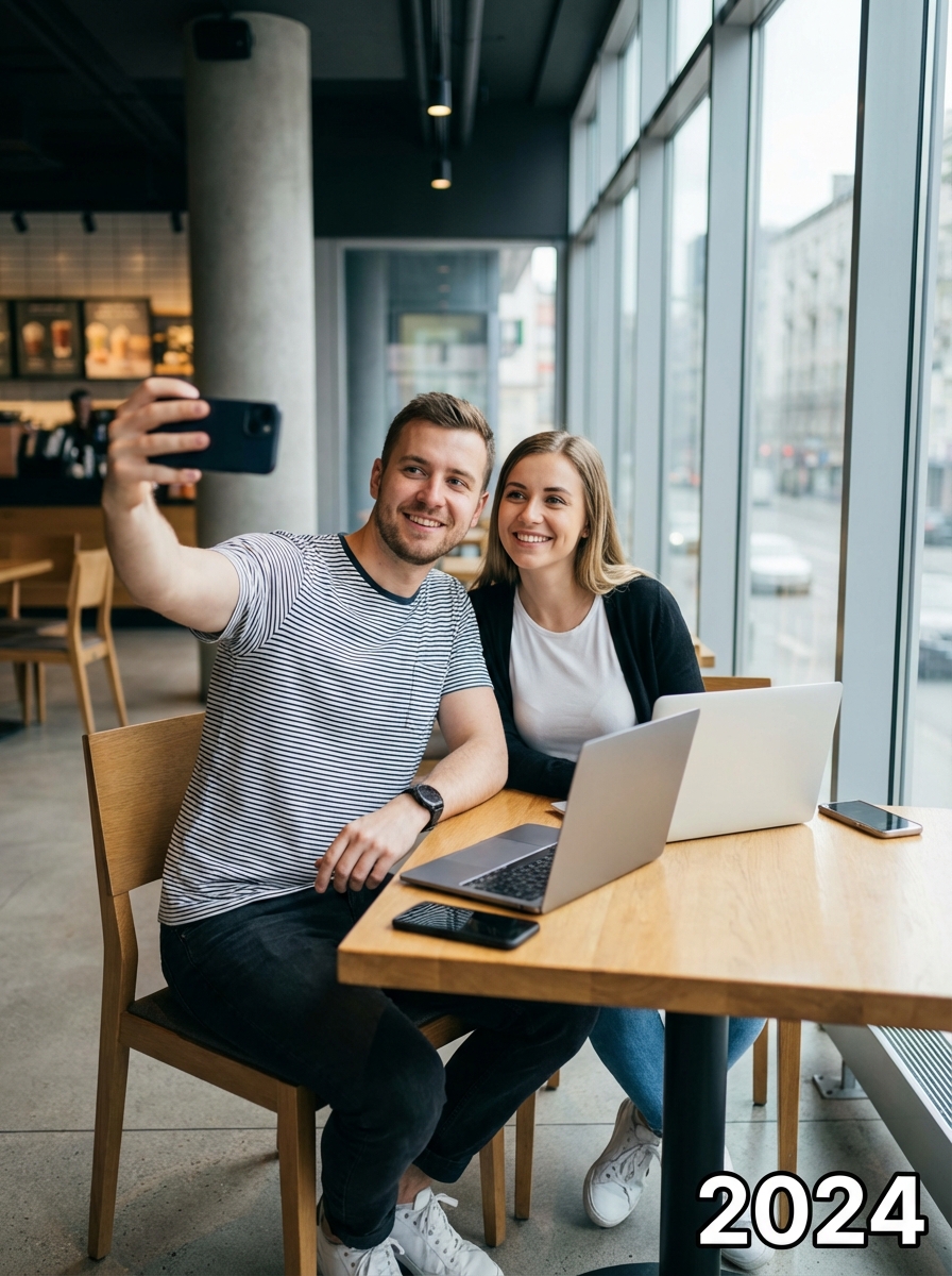 Modern day couple taking a selfie together in contemporary casual clothing, sitting in a trendy coffee shop with laptops and smartphones on the table, natural lighting through large windows, urban lifestyle photography, text overlay in bottom corner reading "{currentYear}" in white sans serif font with black outline