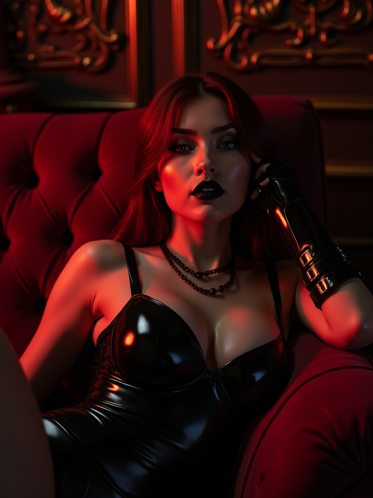 Moody boudoir scene featuring a seductive female model with pale skin and long auburn hair, lying on her side atop a plush velvet couch. She wears a glossy black latex lingerie set with minimal straps and a collar with an attached chain. Her wrists are adorned with leather cuffs, adding a provocative edge. Her intense gaze, dark gothic makeup, and matte black lipstick enhance the bold, dominant energy. The setting is bathed in deep red lighting, casting dramatic shadows against an ornate dark wall backdrop, evoking a dark, seductive, and powerful atmosphere.