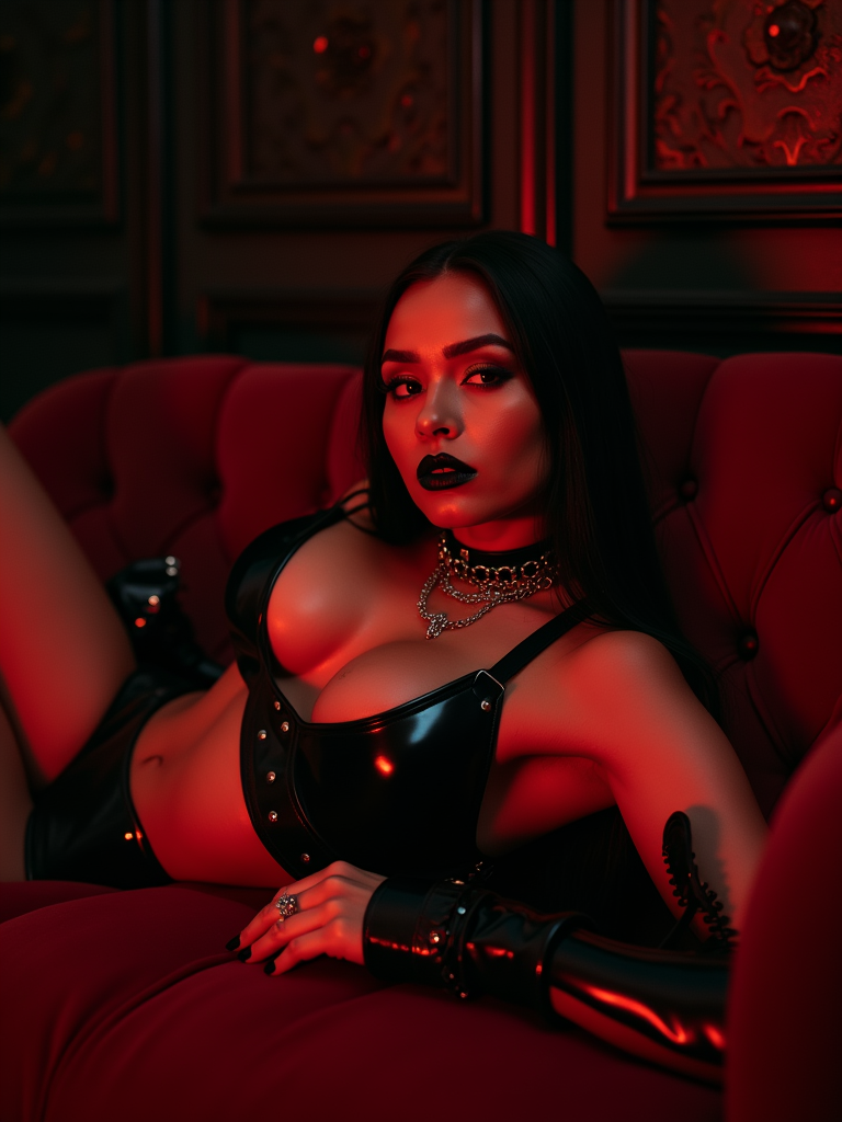 Moody boudoir scene featuring a seductive female model with pale skin and long hair, lying on her side atop a plush velvet couch. She wears a glossy black latex glossy lingerie set with minimal straps and a collar with an attached chain. Her wrists are adorned with leather cuffs, adding a provocative edge. Her intense gaze, dark gothic makeup, and matte black lipstick enhance the bold, dominant energy. The setting is bathed in deep red lighting, casting dramatic shadows against an ornate dark wall backdrop, evoking a dark, seductive, and powerful atmosphere.