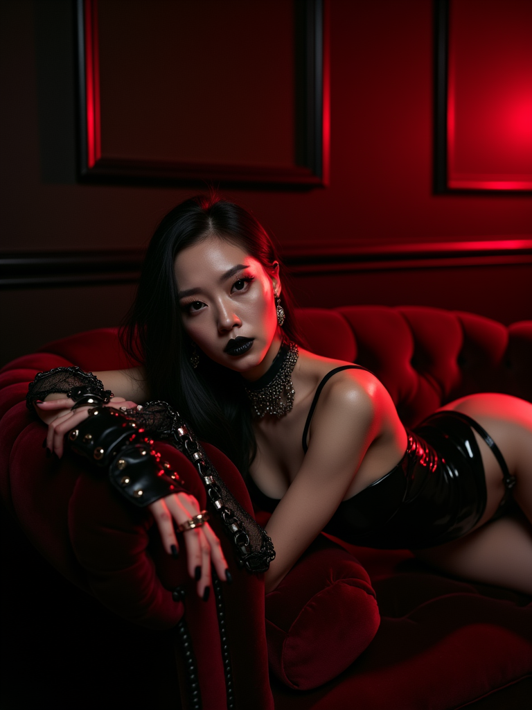 Moody boudoir scene featuring a seductive female model with pale skin and long hair, lying on her side atop a plush velvet couch. She wears a glossy black latex glossy lingerie set with minimal straps and a collar with an attached chain. Her wrists are adorned with leather cuffs, adding a provocative edge. Her intense gaze, dark gothic makeup, and matte black lipstick enhance the bold, dominant energy. The setting is bathed in deep red lighting, casting dramatic shadows against an ornate dark wall backdrop, evoking a dark, seductive, and powerful atmosphere.