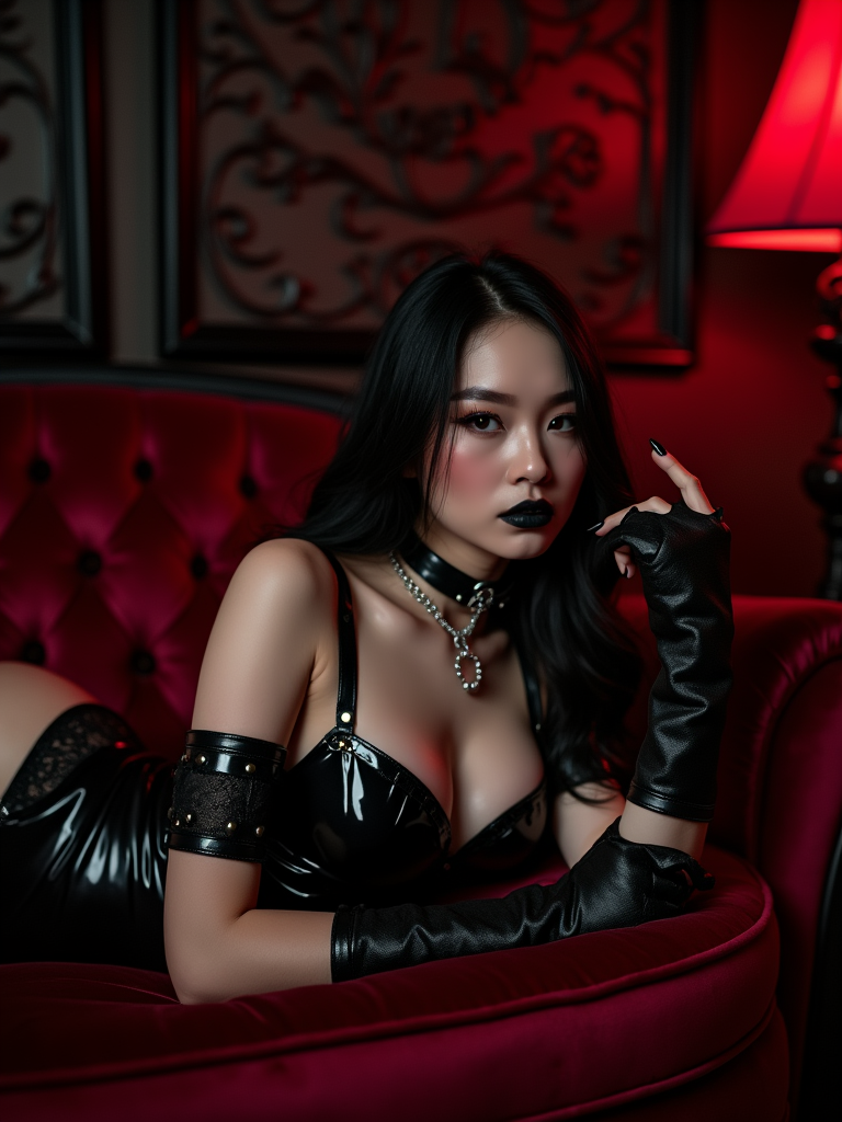Moody boudoir scene featuring a seductive female model with pale skin and long hair, lying on her side atop a plush velvet couch. She wears a glossy black latex glossy lingerie set with minimal straps and a collar with an attached chain. Her wrists are adorned with leather cuffs, adding a provocative edge. Her intense gaze, dark gothic makeup, and matte black lipstick enhance the bold, dominant energy. The setting is bathed in deep red lighting, casting dramatic shadows against an ornate dark wall backdrop, evoking a dark, seductive, and powerful atmosphere.