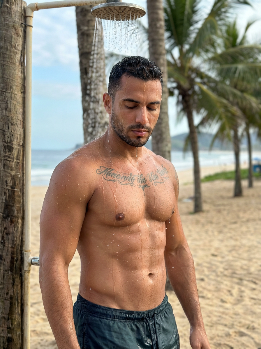 muscular model outdoor shower, beach setting, water droplets on skin, athletic toned body