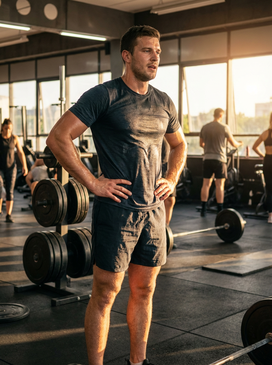 muscular model post-workout, sweaty glow, gym setting, athletic shorts, powerful masculine energy