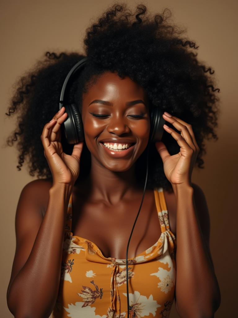 music-enthusiast feminine model relaxing with headphones, exploring new tunes