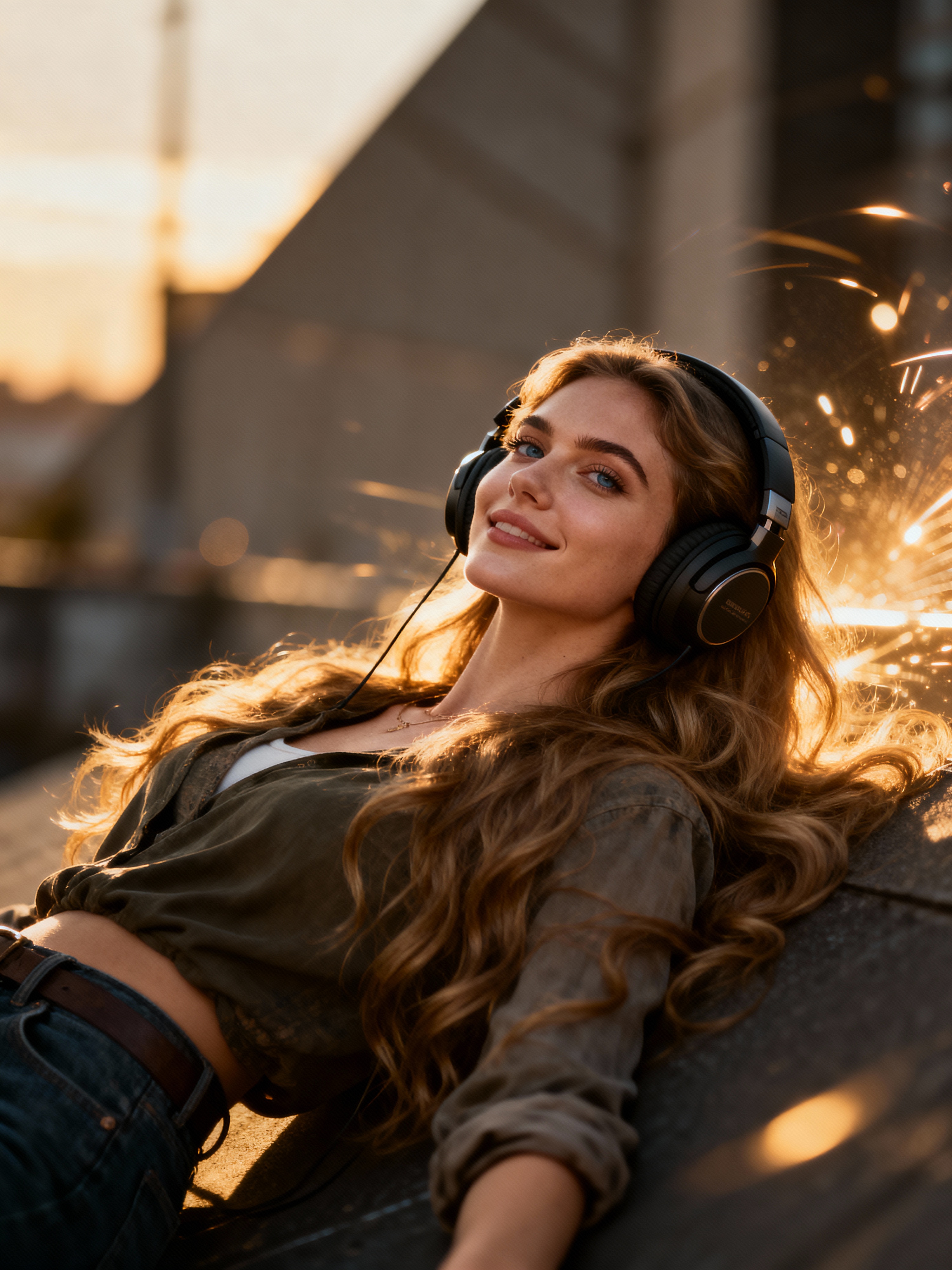 music-enthusiast feminine model relaxing with headphones, exploring new tunes