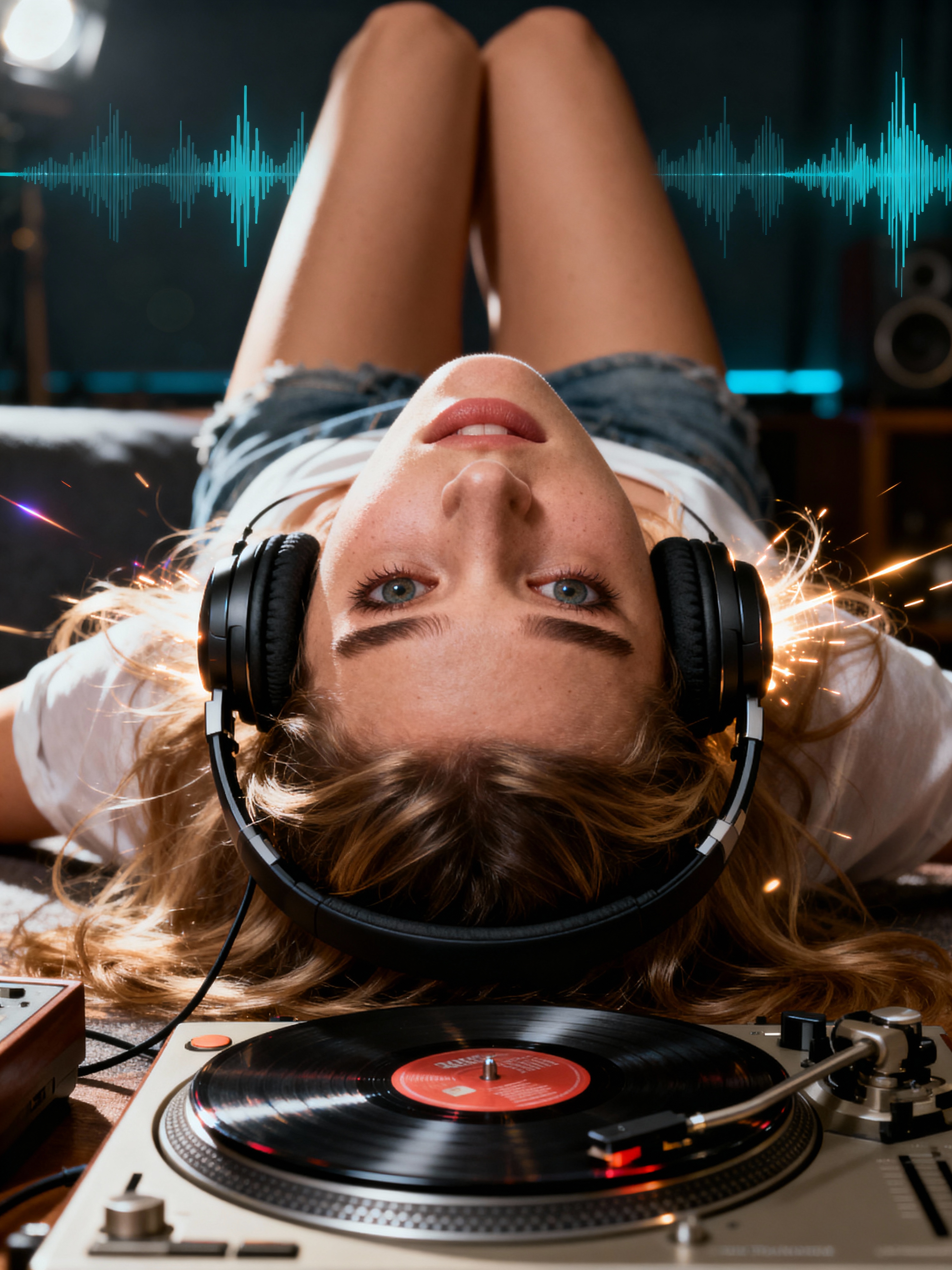 music-enthusiast feminine model relaxing with headphones, exploring new tunes