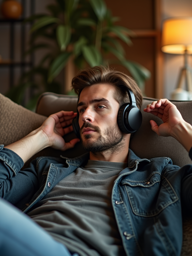 music-enthusiast masculine model relaxing with headphones, exploring new tunes