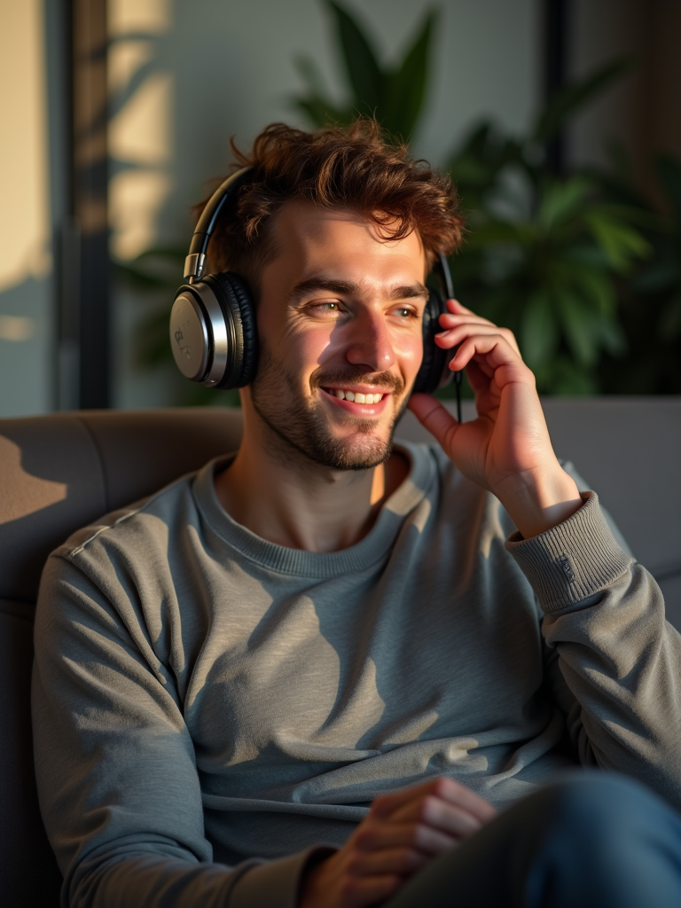music-enthusiast masculine model relaxing with headphones, exploring new tunes