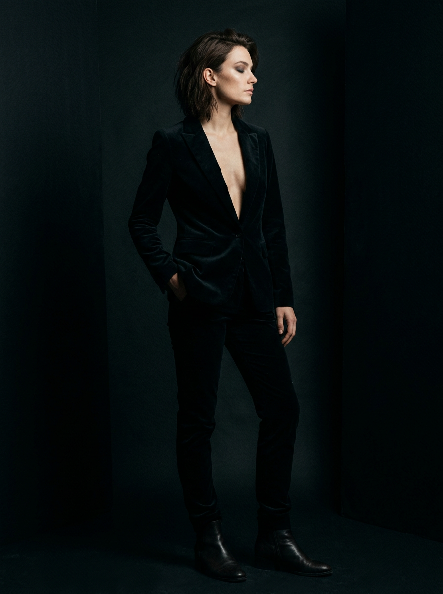 Mysterious young male model standing in velvety darkness, head turned sideways with eyes closed in serene allure, tousled hair, wearing fitted velvet blazer open to smooth chest, slim pants, subtle smoky makeup, single spotlight from side creating chiaroscuro shadows, close-up portrait angle, high-end editorial glamour, sensual mood.