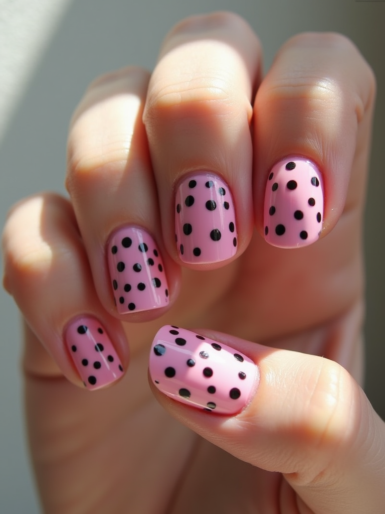 nail design with a pink and black polka dot pattern, cute and playful aesthetic, soft natural lighting, close-up on detail