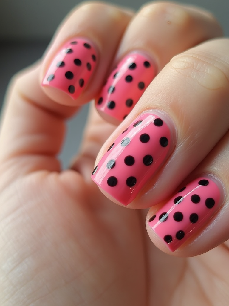 nail design with a pink and black polka dot pattern, cute and playful aesthetic, soft natural lighting, close-up on detail