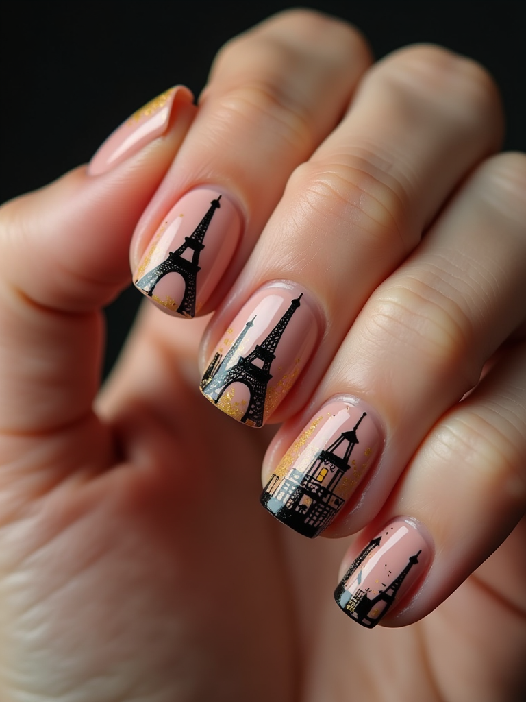nails featuring miniature Eiffel Tower design, Parisian cityscape art, romantic lighting, posed fingers showcasing intricate details