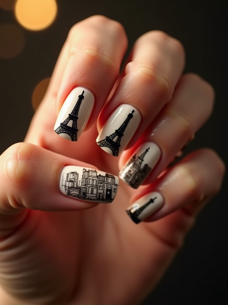 nails featuring miniature Eiffel Tower design, Parisian cityscape art, romantic lighting, posed fingers showcasing intricate details