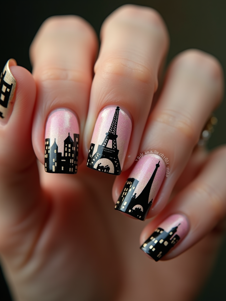 nails featuring miniature Eiffel Tower design, Parisian cityscape art, romantic lighting, posed fingers showcasing intricate details