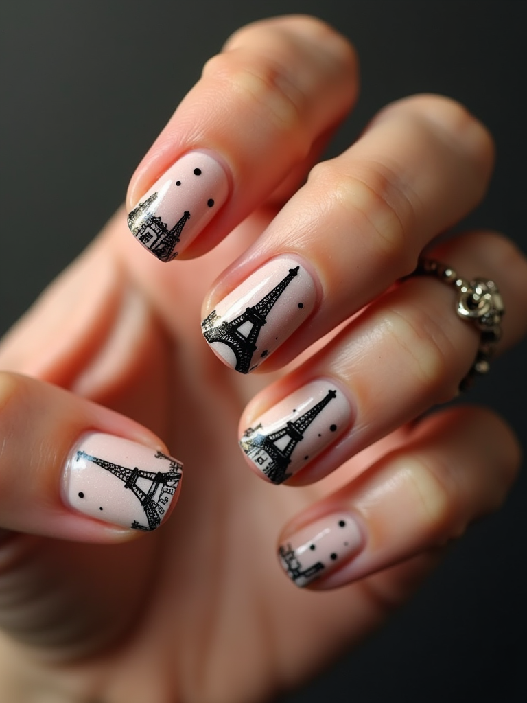 nails featuring miniature Eiffel Tower design, Parisian cityscape art, romantic lighting, posed fingers showcasing intricate details