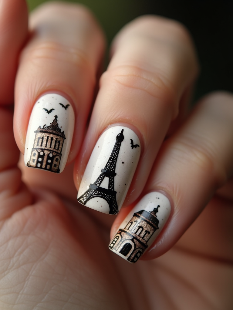 nails featuring miniature Eiffel Tower design, Parisian cityscape art, romantic lighting, posed fingers showcasing intricate details
