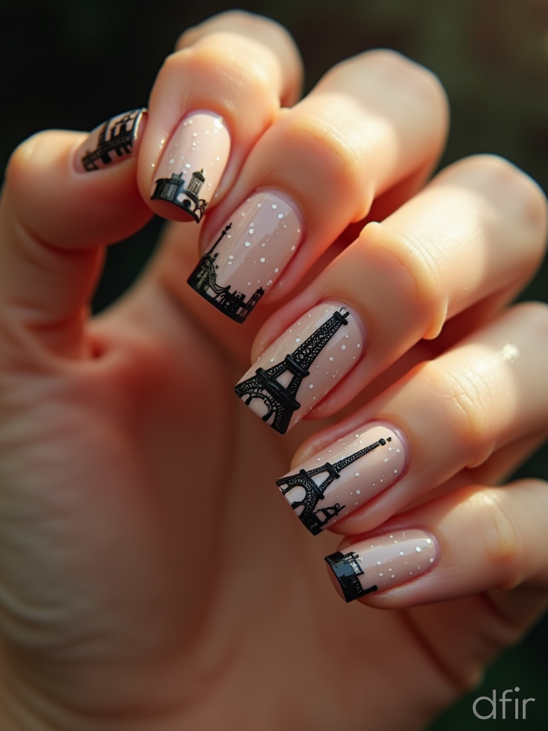 nails featuring miniature Eiffel Tower design, Parisian cityscape art, romantic lighting, posed fingers showcasing intricate details