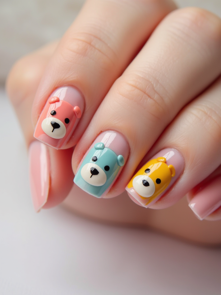 nails with adorable 3D teddy bear art, each nail featuring a different colored bear, soft pastel background, close-up detail shot