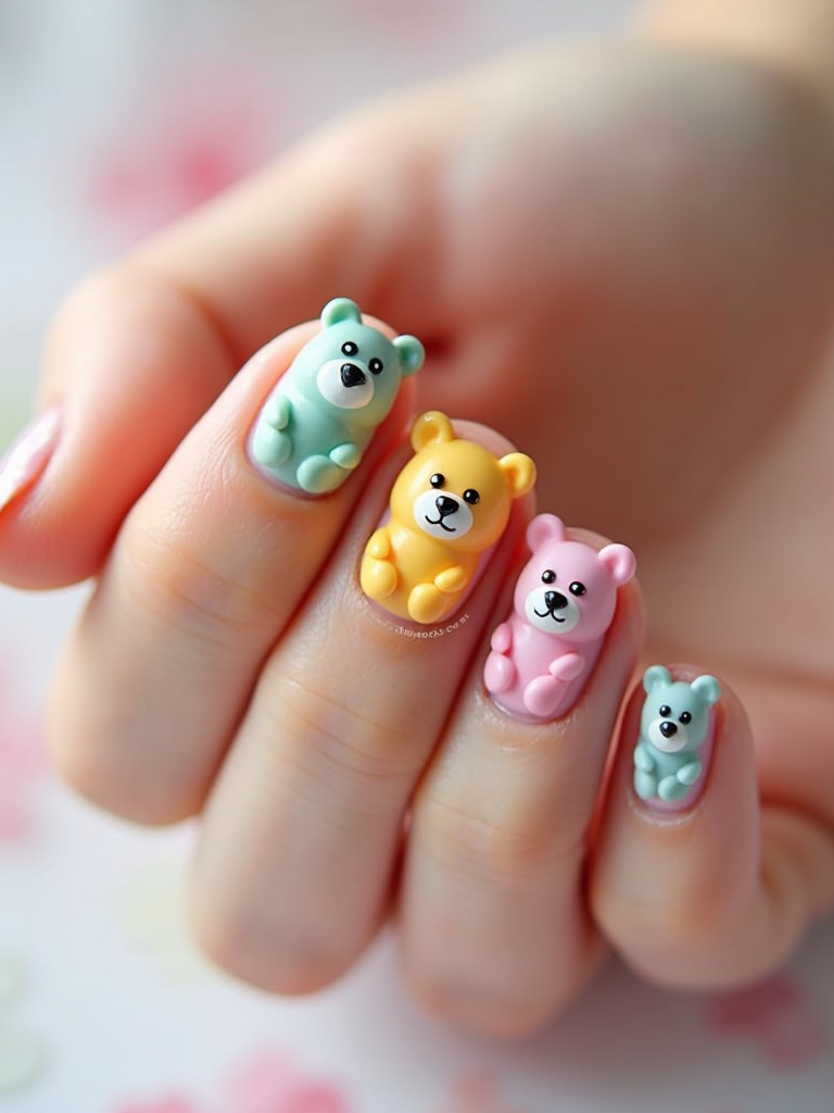 nails with adorable 3D teddy bear art, each nail featuring a different colored bear, soft pastel background, close-up detail shot