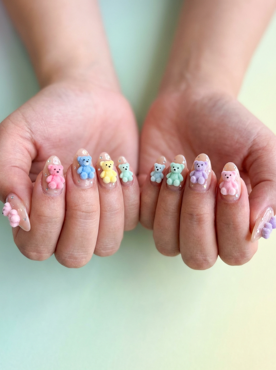 nails with adorable 3D teddy bear art, each nail featuring a different colored bear, soft pastel background, close-up detail shot
