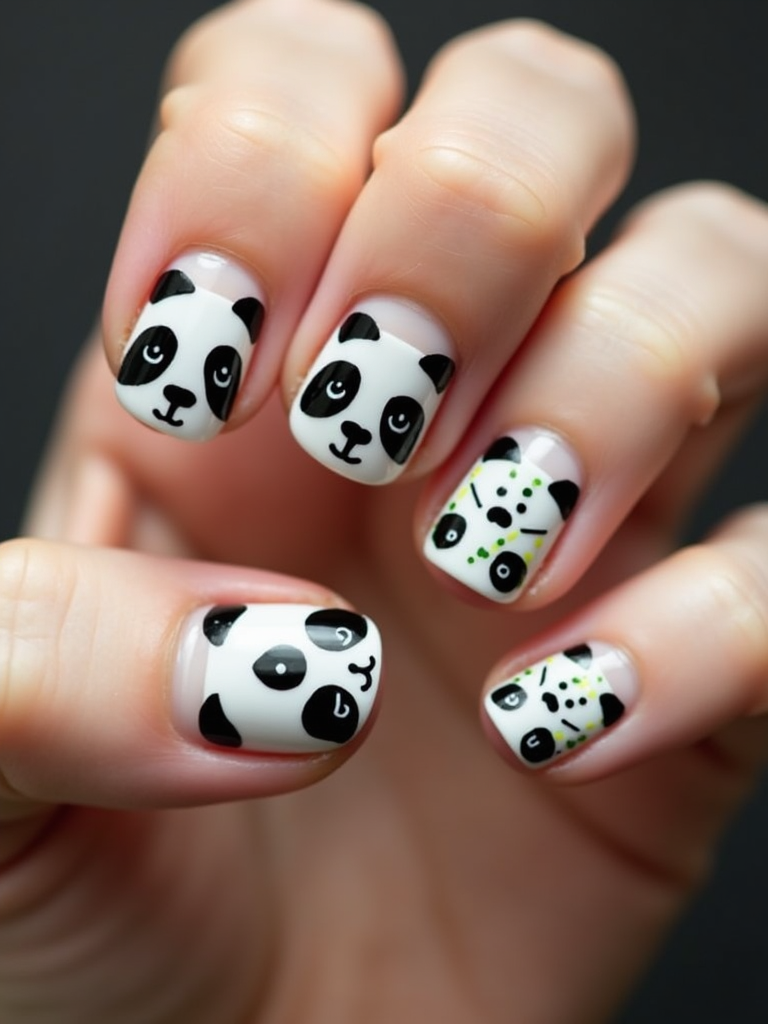 nails with cute panda bear designs, black and white with bamboo accents, playful hand pose, macro photography focus