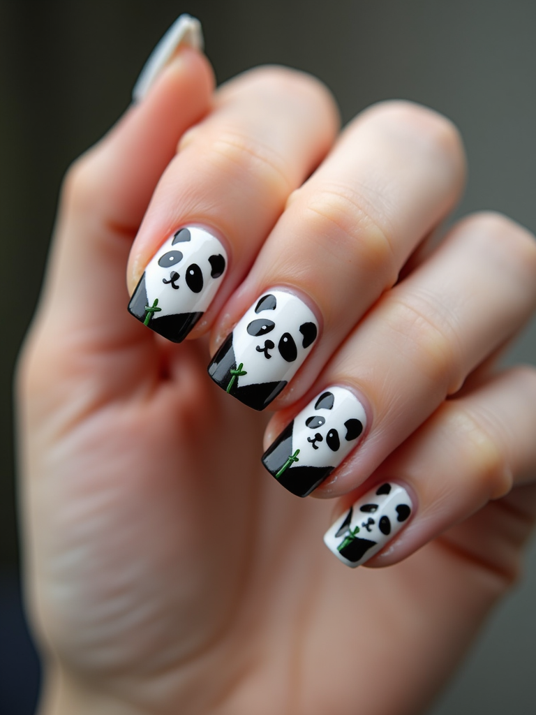 nails with cute panda bear designs, black and white with bamboo accents, playful hand pose, macro photography focus