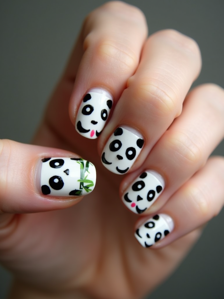 nails with cute panda bear designs, black and white with bamboo accents, playful hand pose, macro photography focus