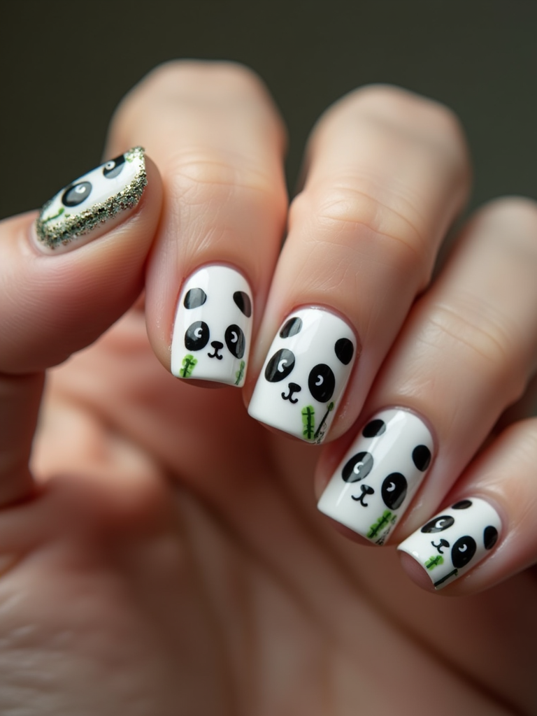 nails with cute panda bear designs, black and white with bamboo accents, playful hand pose, macro photography focus