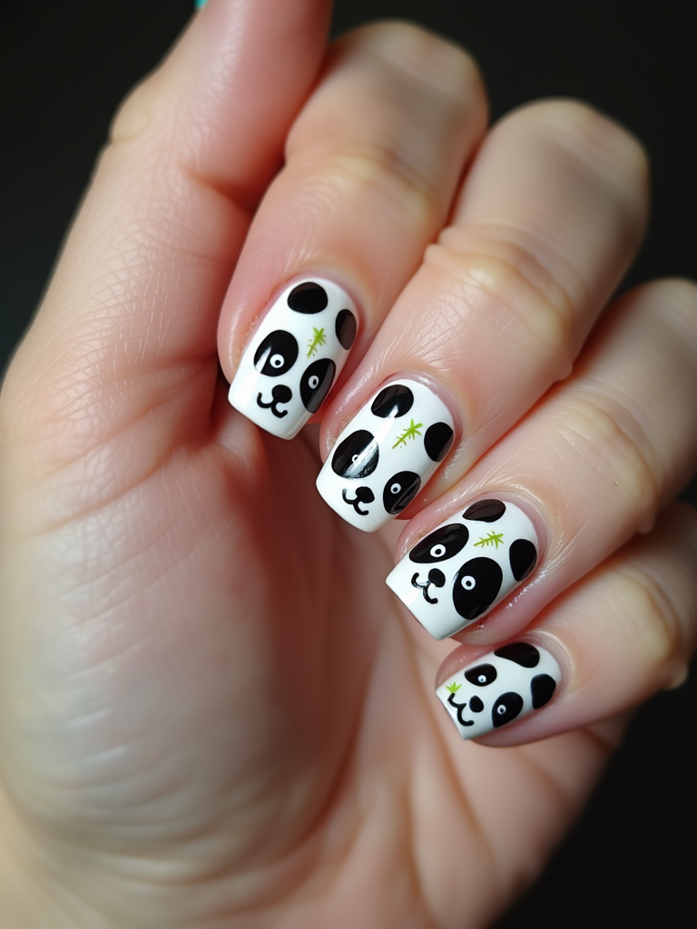 nails with cute panda bear designs, black and white with bamboo accents, playful hand pose, macro photography focus
