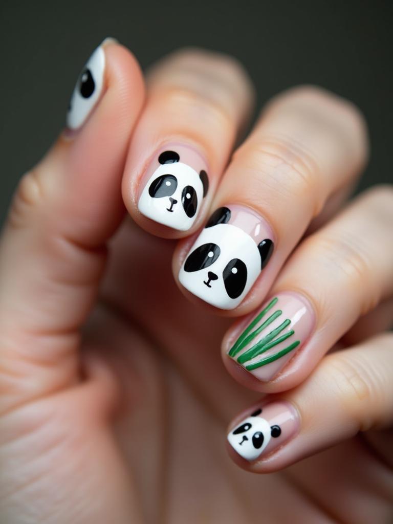 nails with cute panda bear designs, black and white with bamboo accents, playful hand pose, macro photography focus