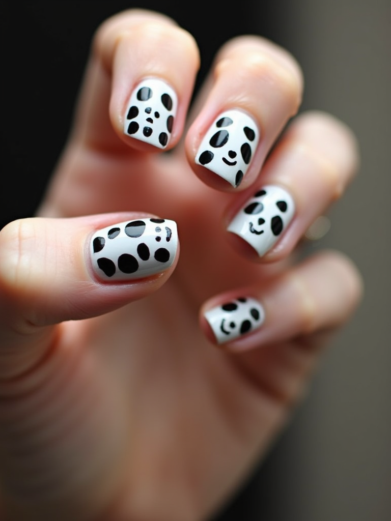 nails with cute panda bear designs, black and white with bamboo accents, playful hand pose, macro photography focus